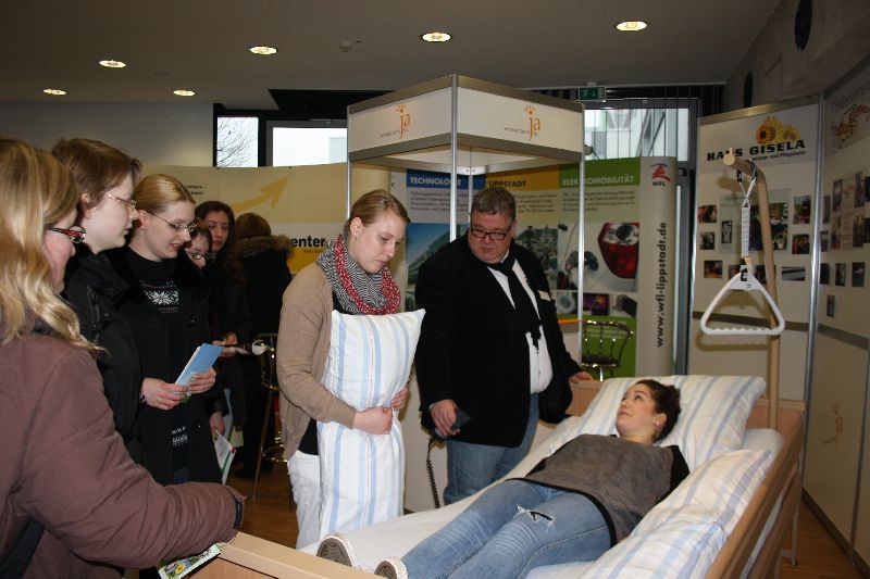 Die Möglichkeiten, einen Alterssimulationsanzug auszuprobieren, Einblicke in Lagerungstechniken am Pflegebett zu gewinnen oder die Fahrt mit einem Elektrorollstuhl auszuprobieren, stießen auf reges Interesse.
